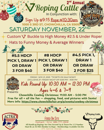 Roping event including kids round up. In conjunction with Chowchilla Cowboy Christmas. See flyer for details