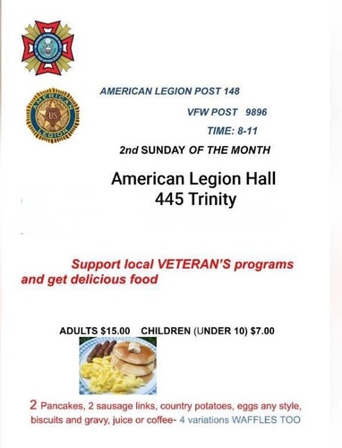 Monthly American Legion Breakfast is this coming the second Sunday morning from 8am - 11am of the month.