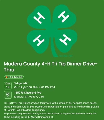 Serves a family of 4 with a whole tri-tip, rice pilaf, ranch beans, bread and fresh fruit for $60. Desserts are available for purchase at the drive-thru pick-up at Hatfield Hall at Madera Fairgrounds.